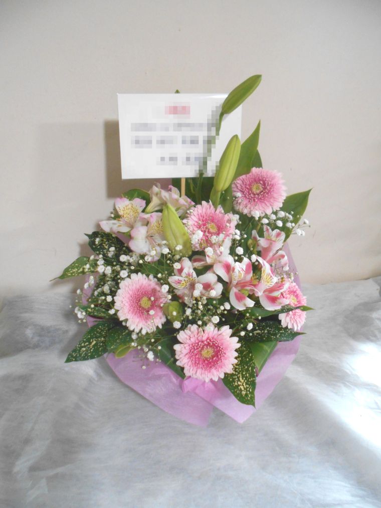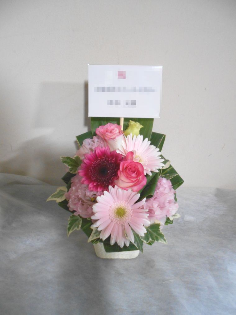 アレンジメントの実際にお届けした写真です。花秘書では発送前に写真をメールで送信致しますので安心して大切な顧客や取引様へのギフトにご利用頂けます。