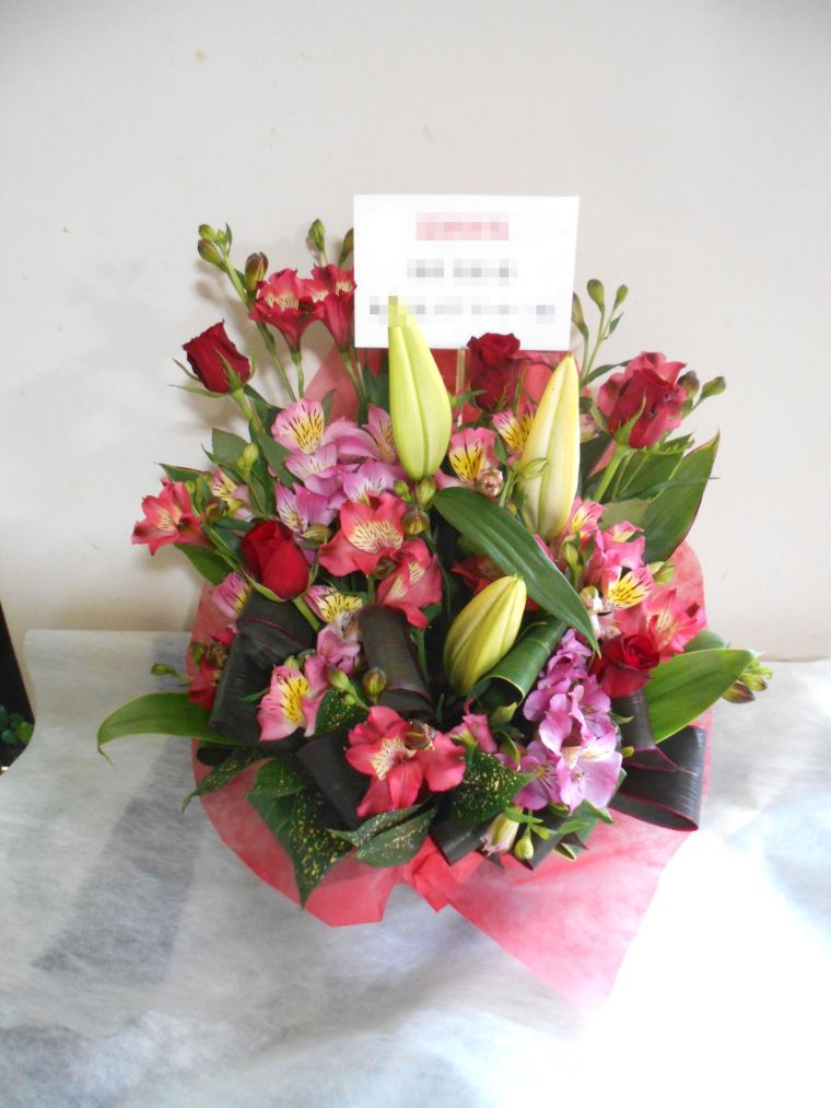 アレンジメントの実際にお届けした写真です。花秘書では発送前に写真をメールで送信致しますので安心して大切な顧客や取引様へのギフトにご利用頂けます。