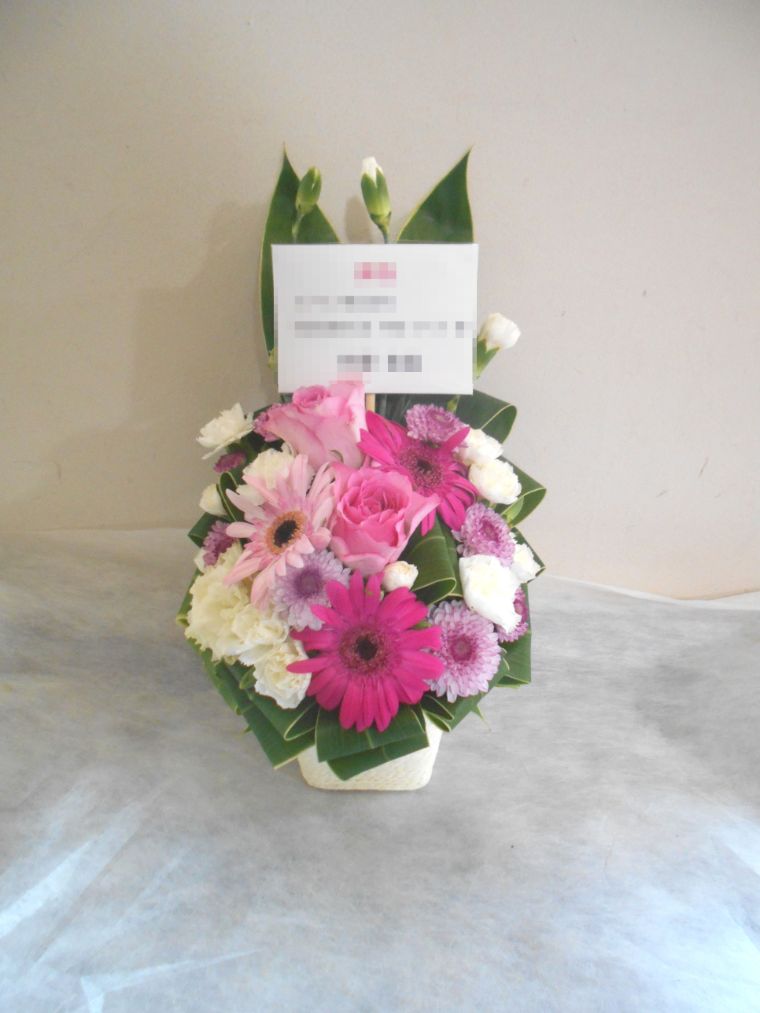 アレンジメントの実際にお届けした写真です。花秘書では発送前に写真をメールで送信致しますので安心して大切な顧客や取引様へのギフトにご利用頂けます。