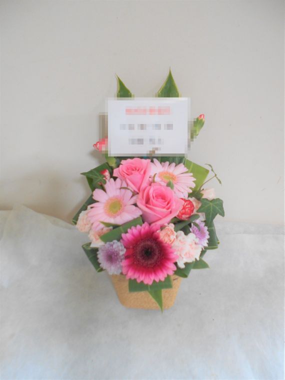アレンジメントの実際にお届けした写真です。花秘書では発送前に写真をメールで送信致しますので安心して大切な顧客や取引様へのギフトにご利用頂けます。