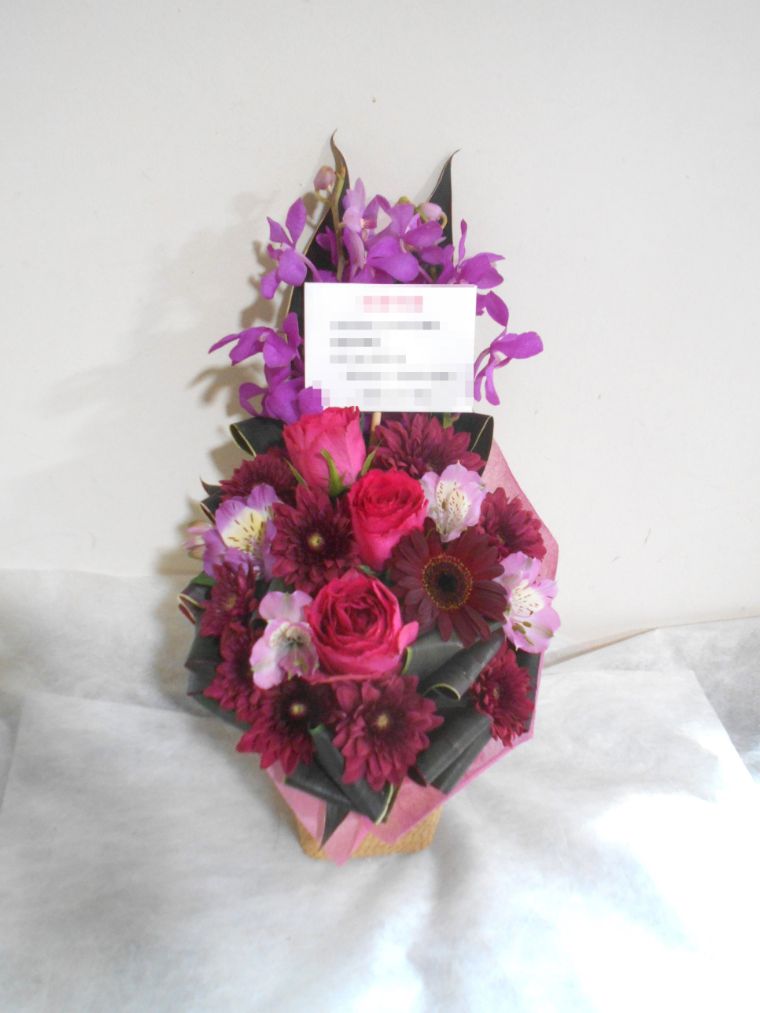 アレンジメントの実際にお届けした写真です。花秘書では発送前に写真をメールで送信致しますので安心して大切な顧客や取引様へのギフトにご利用頂けます。