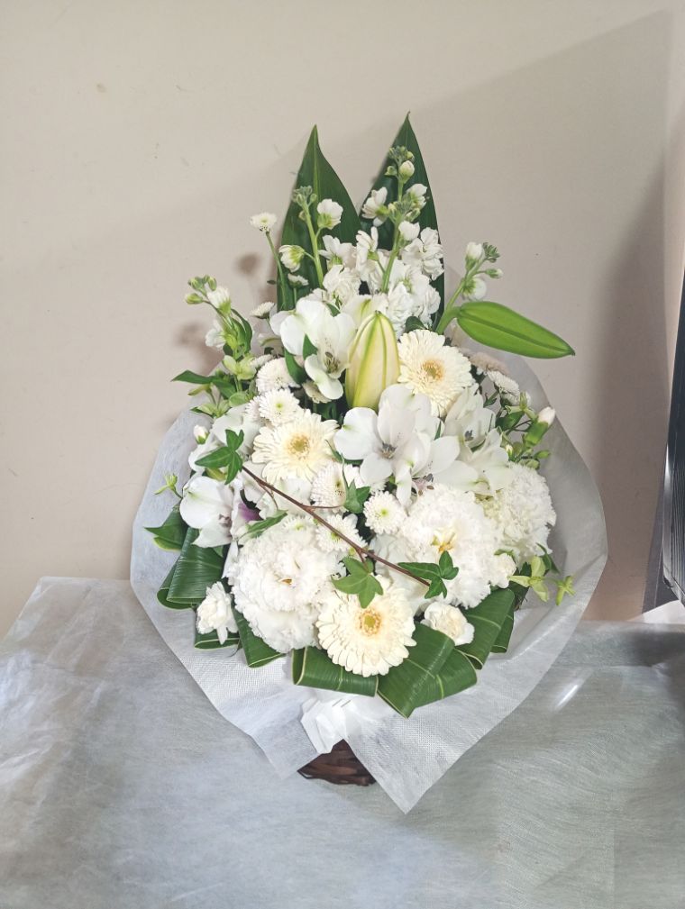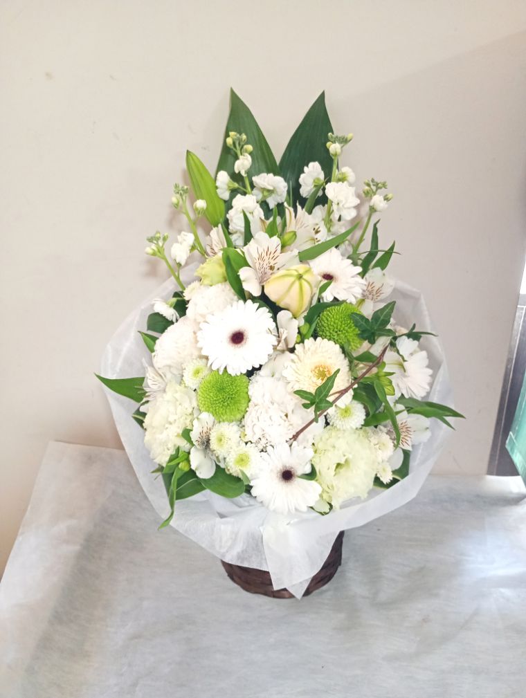 【白系】お悔やみ お供えの花 供花 (ホワイト&淡色カラーの手付きバスケットアレンジ)