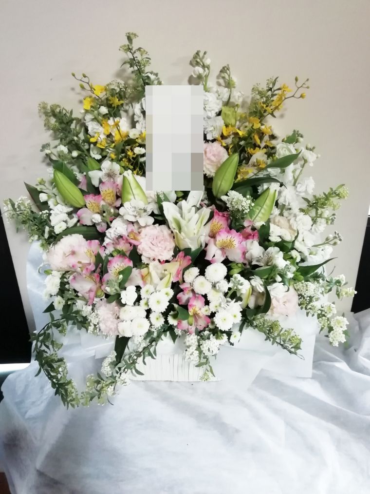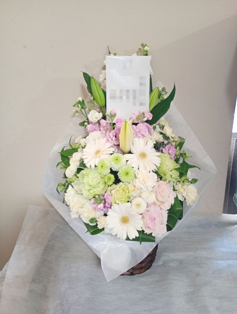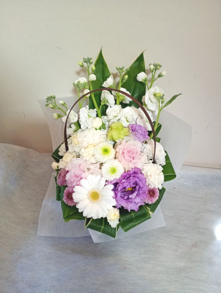 お悔やみ お供えの花 供花 (ホワイト&淡色カラーの手付きバスケットアレンジ)
