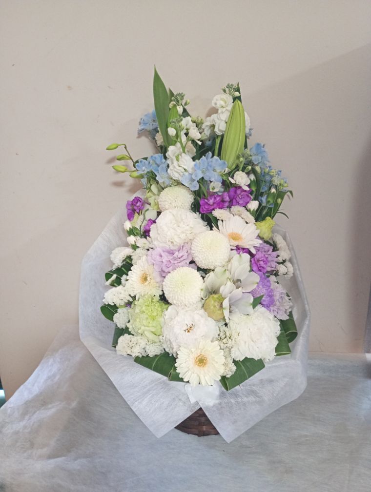 お悔やみ お供えの花 供花 (ホワイト&青・紫系カラーのお花でまとめたバスケットアレンジ)