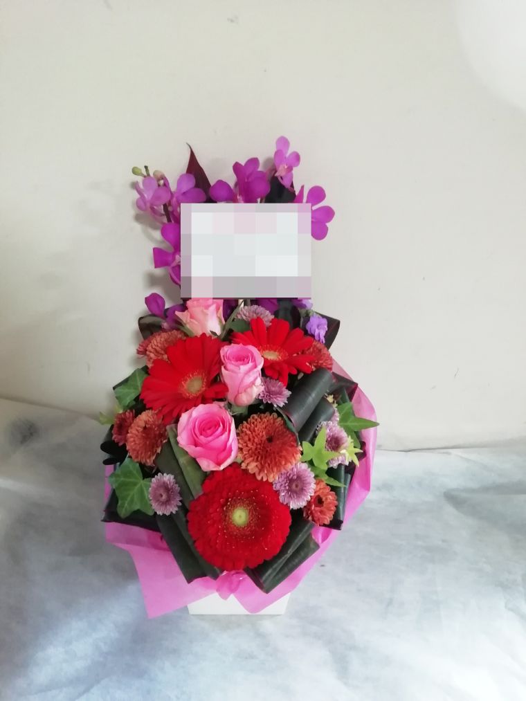 アレンジメントの実際にお届けした写真です。花秘書では発送前に写真をメールで送信致しますので安心して大切な顧客や取引様へのギフトにご利用頂けます。