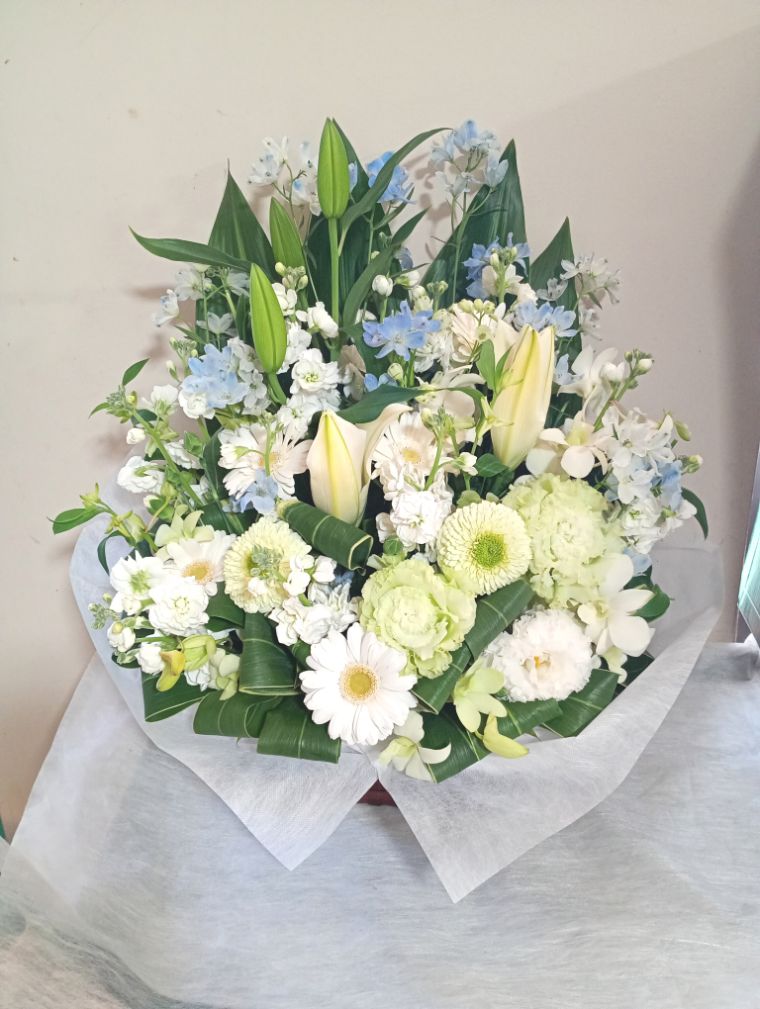 お悔やみ お供えの花 供花 (白ユリをメインに淡いブルーのお花をあしらった横長のバスケットアレンジ)