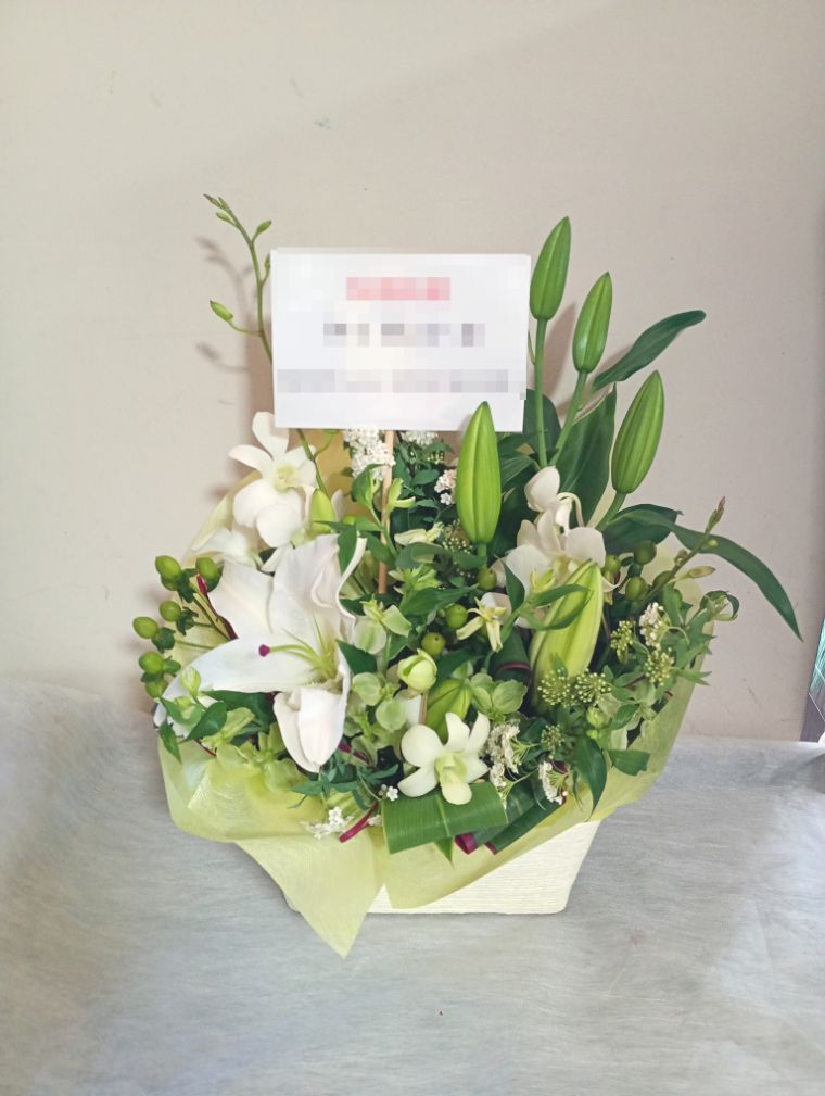 お悔やみ お供えの花 供花 (白ユリをメインにホワイト&グリーンでまとめたバスケットアレンジ)