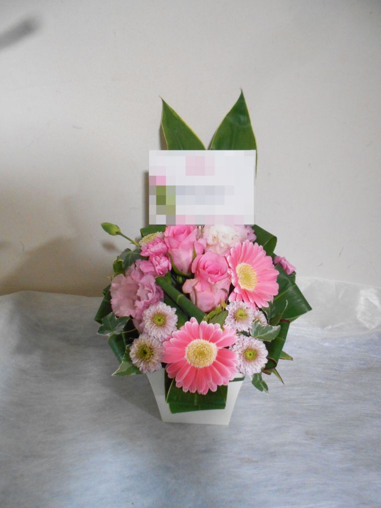 アレンジメントの実際にお届けした写真です。花秘書では発送前に写真をメールで送信致しますので安心して大切な顧客や取引様へのギフトにご利用頂けます。