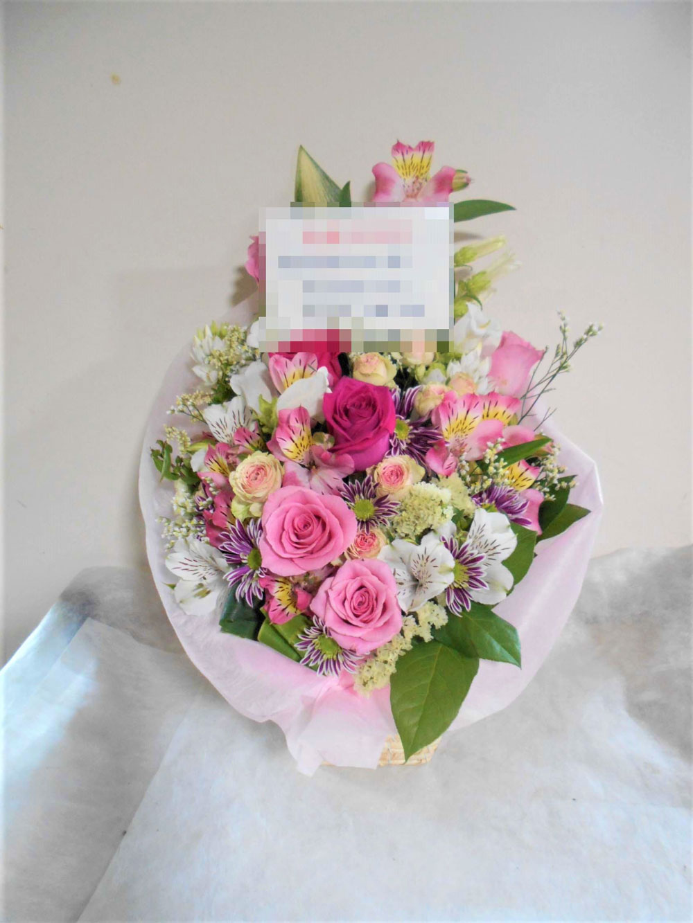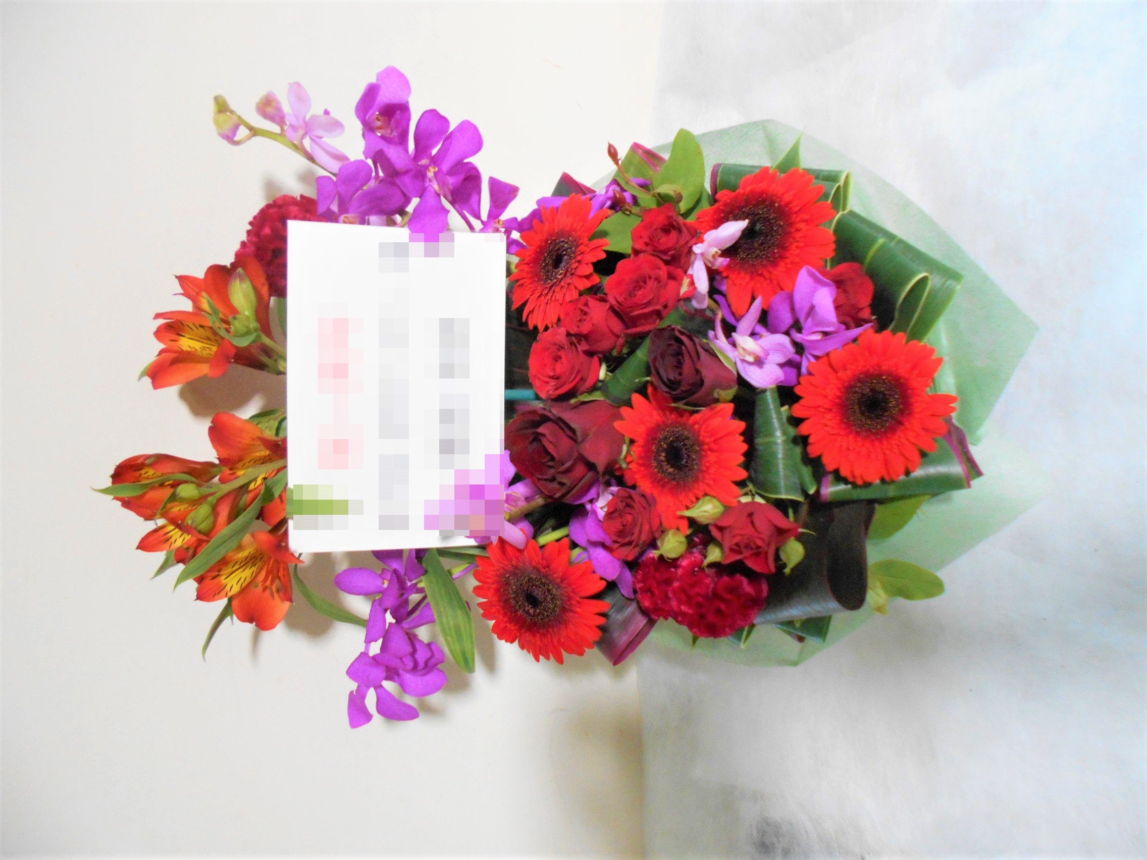 アレンジメントの実際にお届けした写真です。花秘書では発送前に写真をメールで送信致しますので安心して大切な顧客や取引様へのギフトにご利用頂けます。