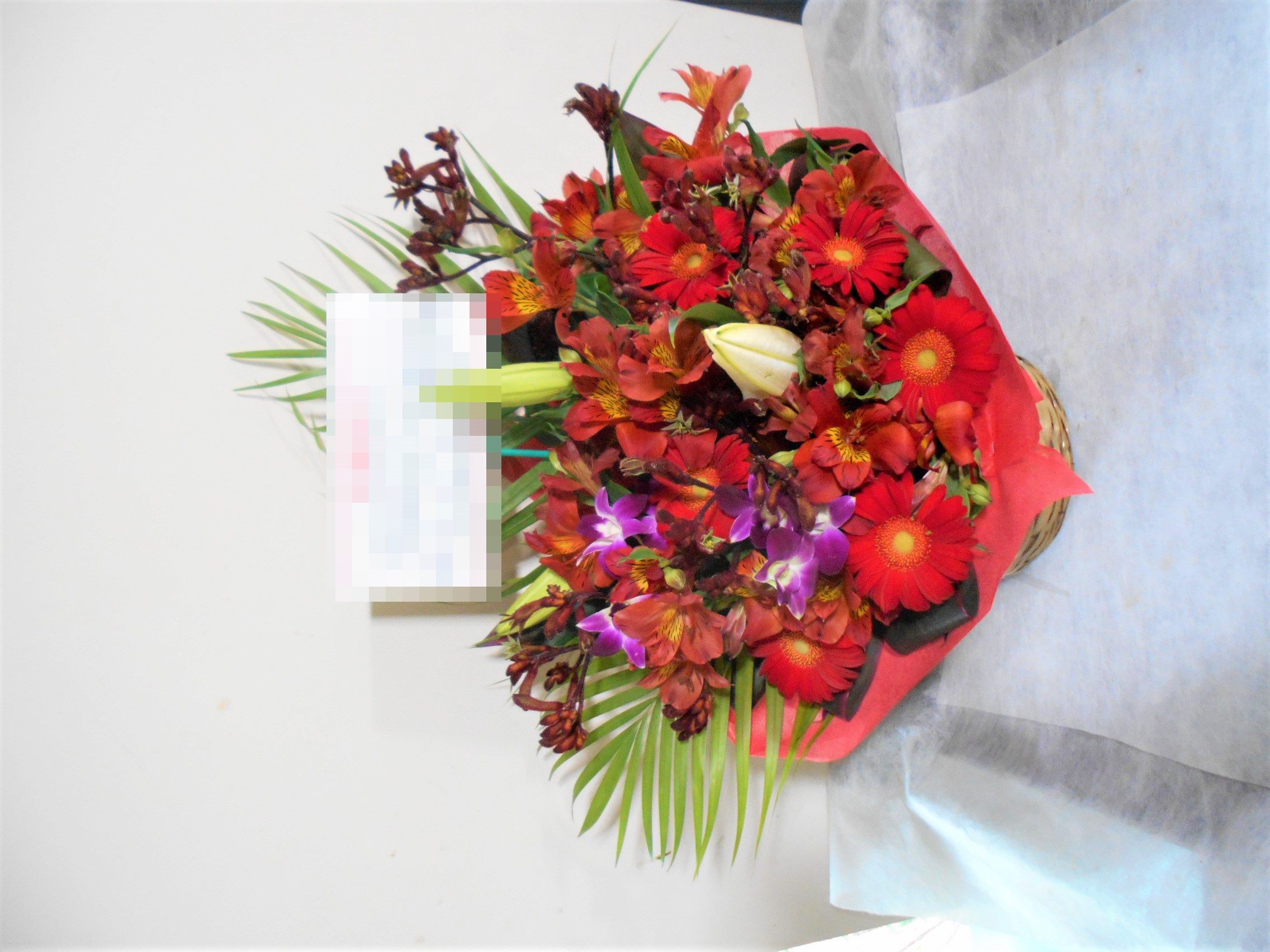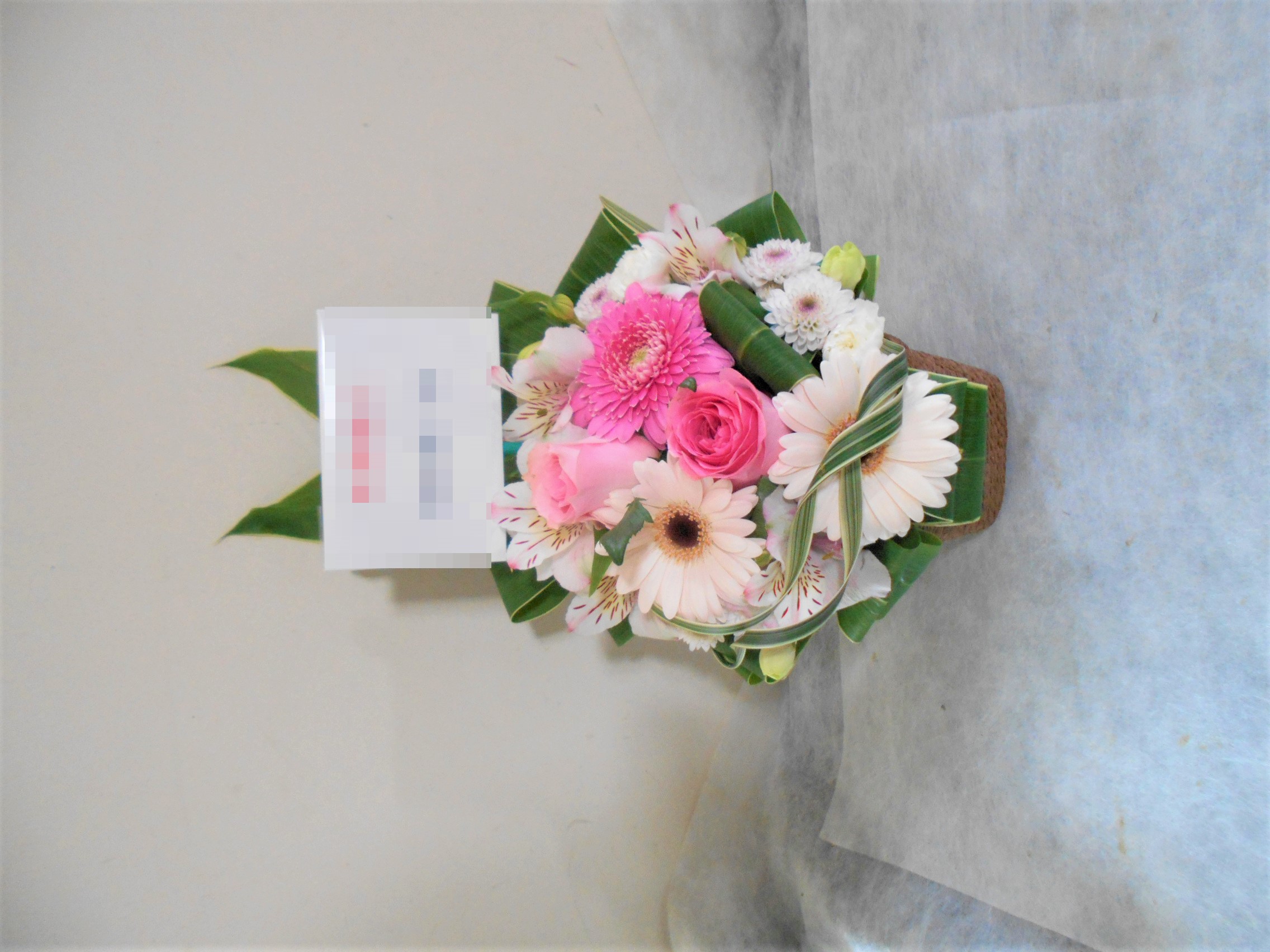 アレンジメントの実際にお届けした写真です。花秘書では発送前に写真をメールで送信致しますので安心して大切な顧客や取引様へのギフトにご利用頂けます。