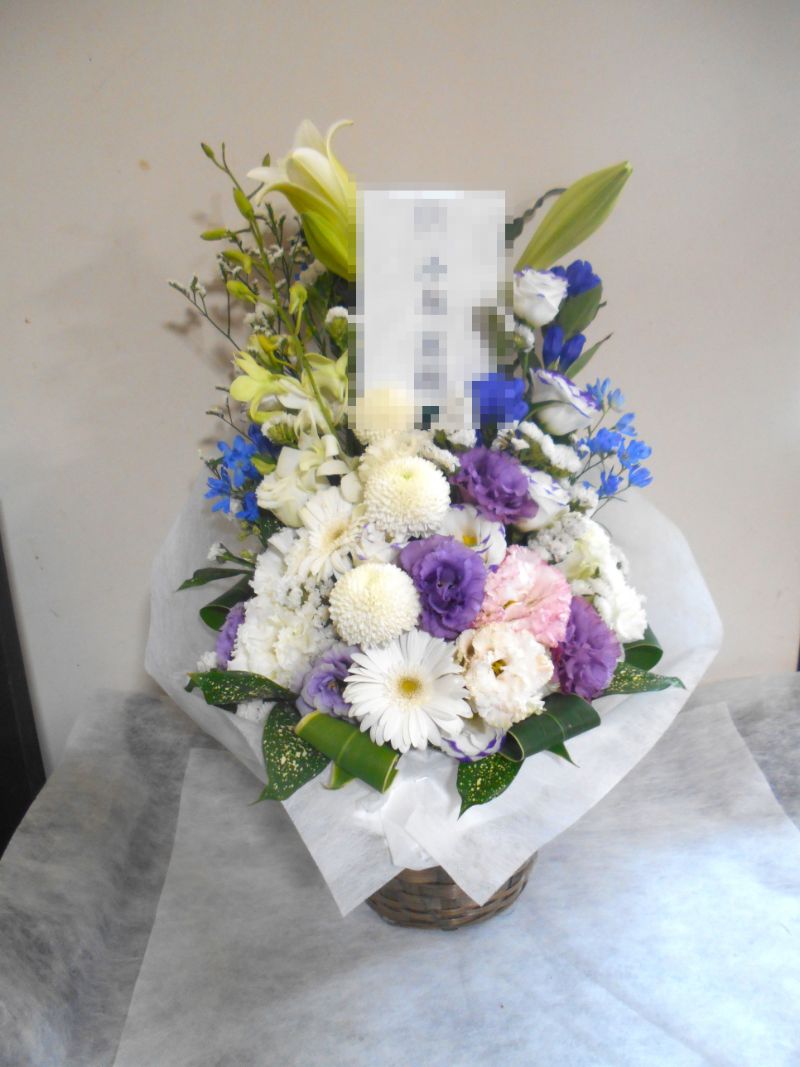 お悔やみ お供えの花 供花 (ホワイト&青・紫系カラーのお花でまとめたバスケットアレンジ)