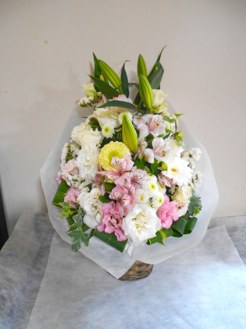 お悔やみ お供えの花 供花 (ホワイト&淡色カラーの手付きバスケットアレンジ)