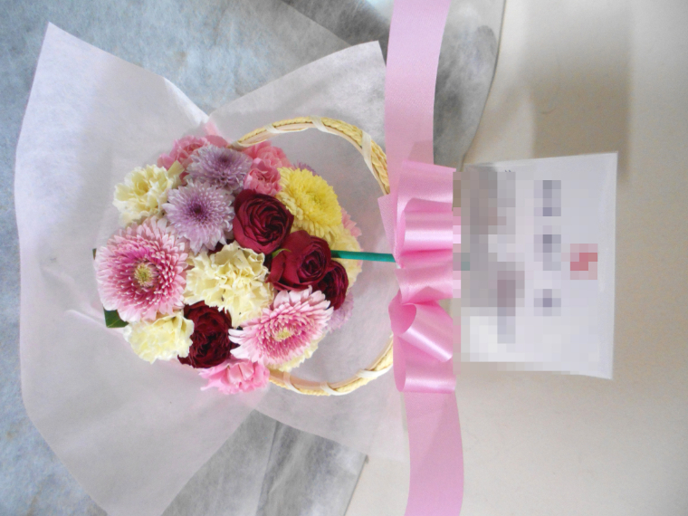 アレンジメントの実際にお届けした写真です。花秘書では発送前に写真をメールで送信致しますので安心して大切な顧客や取引様へのギフトにご利用頂けます。