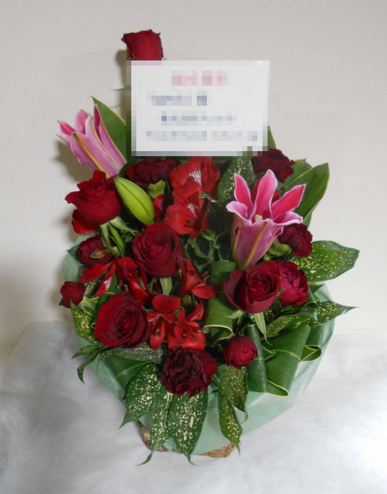 アレンジメントの実際にお届けした写真です。花秘書では発送前に写真をメールで送信致しますので安心して大切な顧客や取引様へのギフトにご利用頂けます。