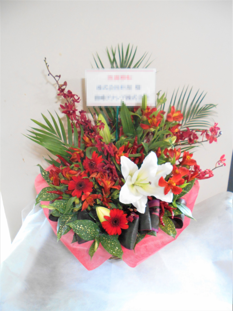 アレンジメントの実際にお届けした写真です。花秘書では発送前に写真をメールで送信致しますので安心して大切な顧客や取引様へのギフトにご利用頂けます。