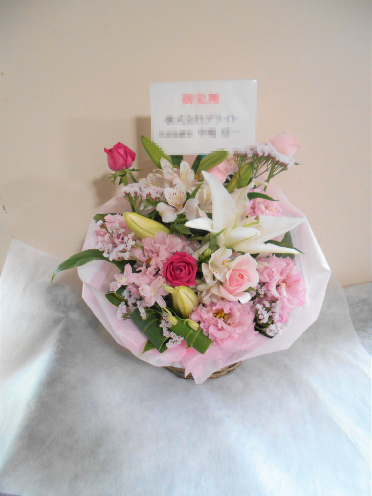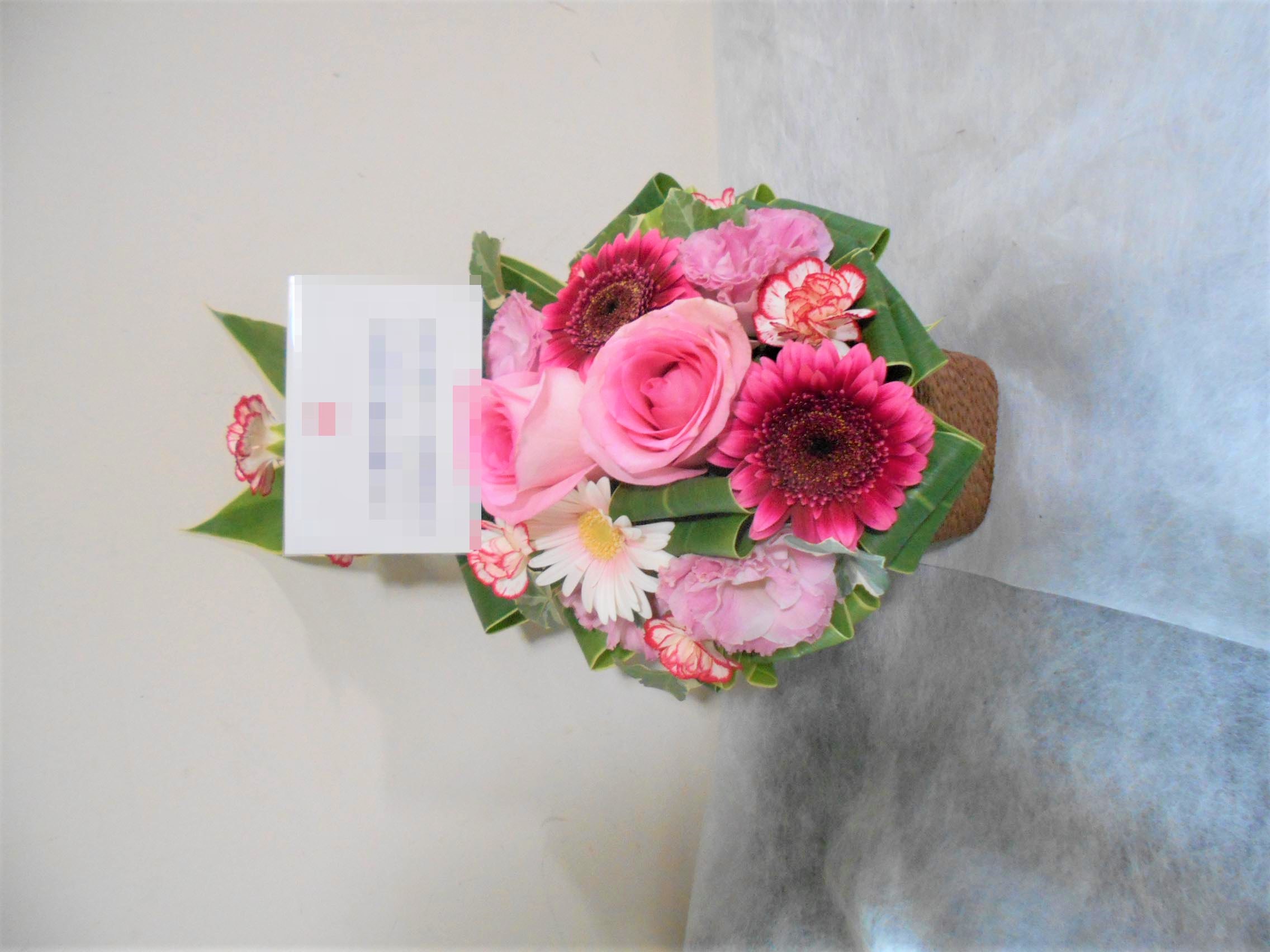 アレンジメントの実際にお届けした写真です。花秘書では発送前に写真をメールで送信致しますので安心して大切な顧客や取引様へのギフトにご利用頂けます。