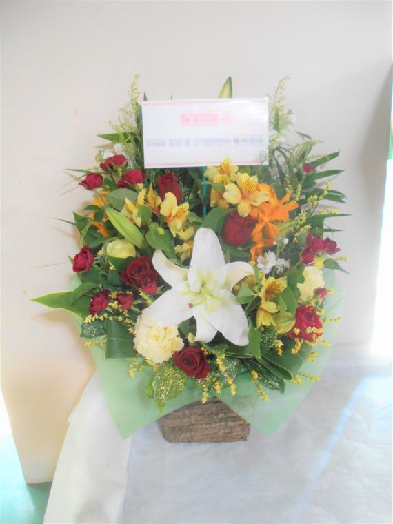 アレンジメントの実際にお届けした写真です。花秘書では発送前に写真をメールで送信致しますので安心して大切な顧客や取引様へのギフトにご利用頂けます。
