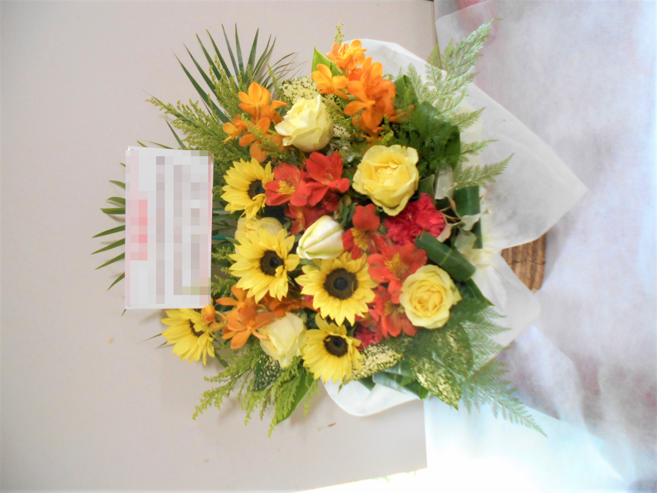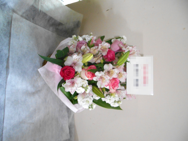アレンジメントの実際にお届けした写真です。花秘書では発送前に写真をメールで送信致しますので安心して大切な顧客や取引様へのギフトにご利用頂けます。