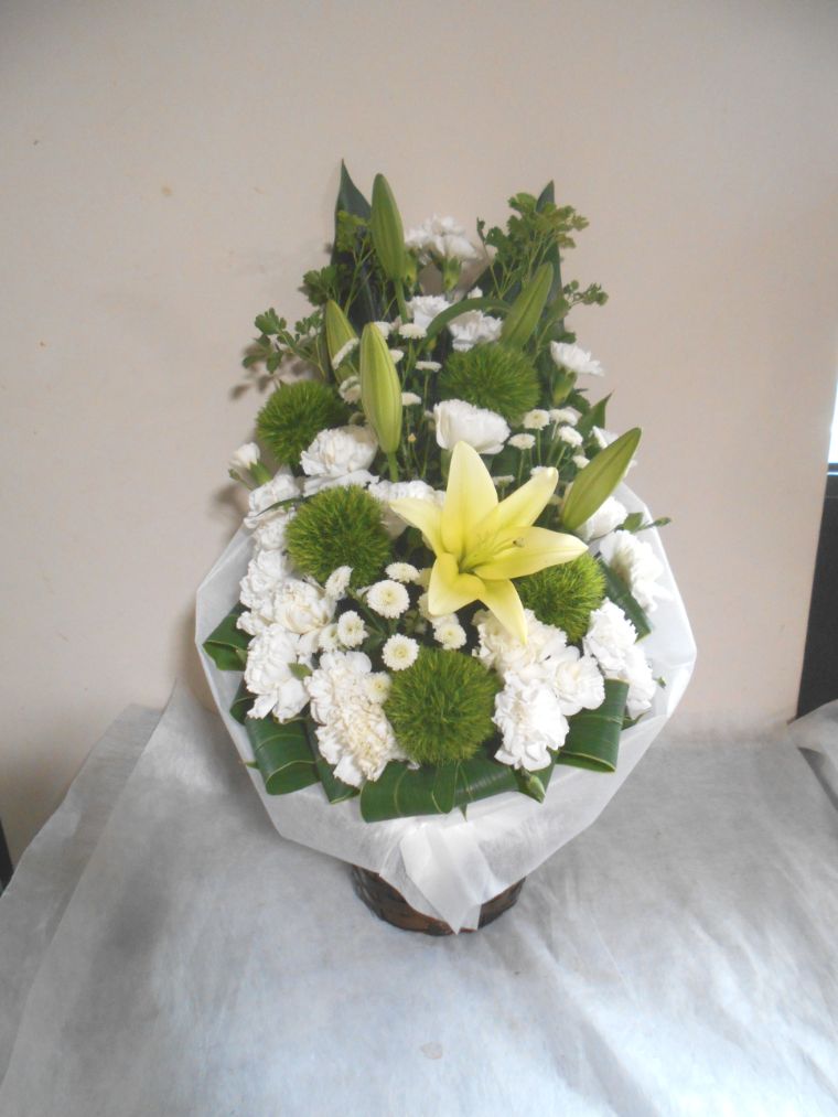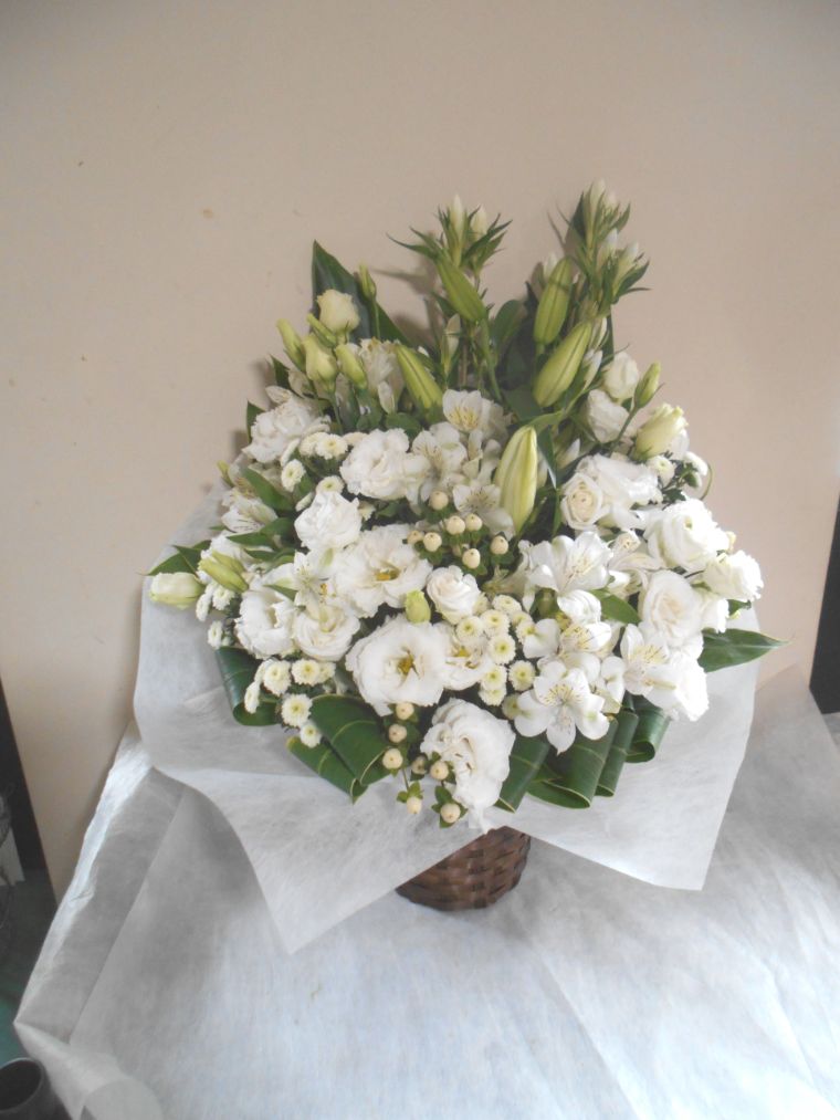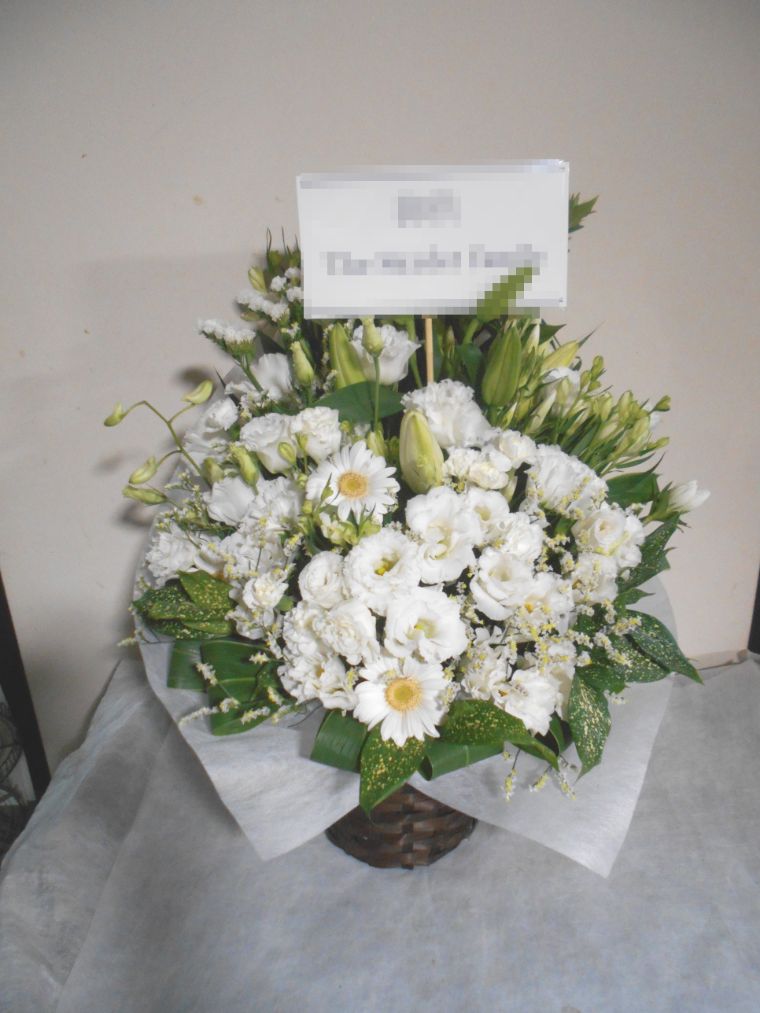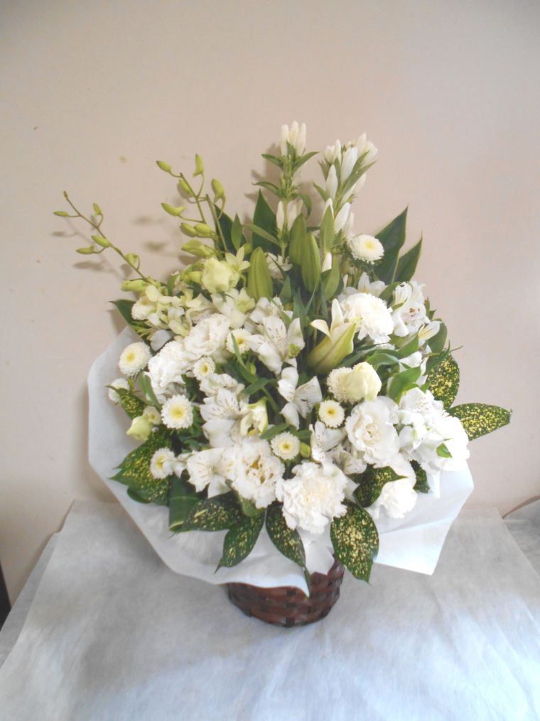 お悔やみ お供えの花 供花 (白いユリとガーベラをメインにホワイト&グリーンでまとめたバスケットアレンジ)