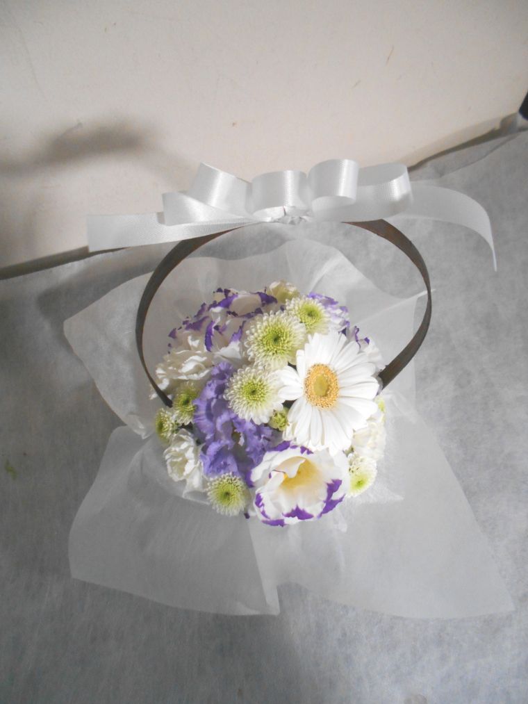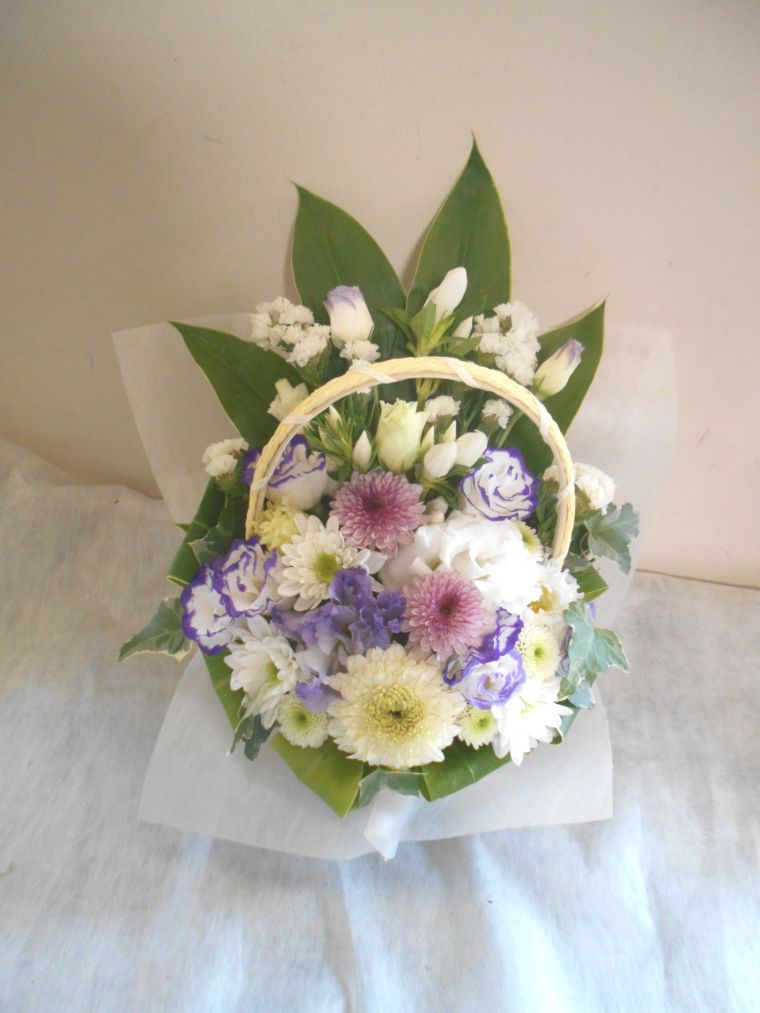 お悔やみ お供えの花 供花 (ホワイト&薄紫系でまとめた手付きのバスケットアレンジ)