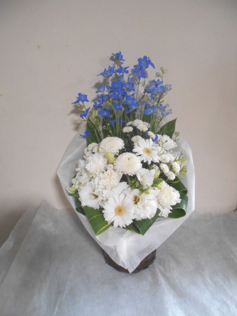 お悔やみ お供えの花 供花 (白基調に青系挿し色をそえたバスケットアレンジ)