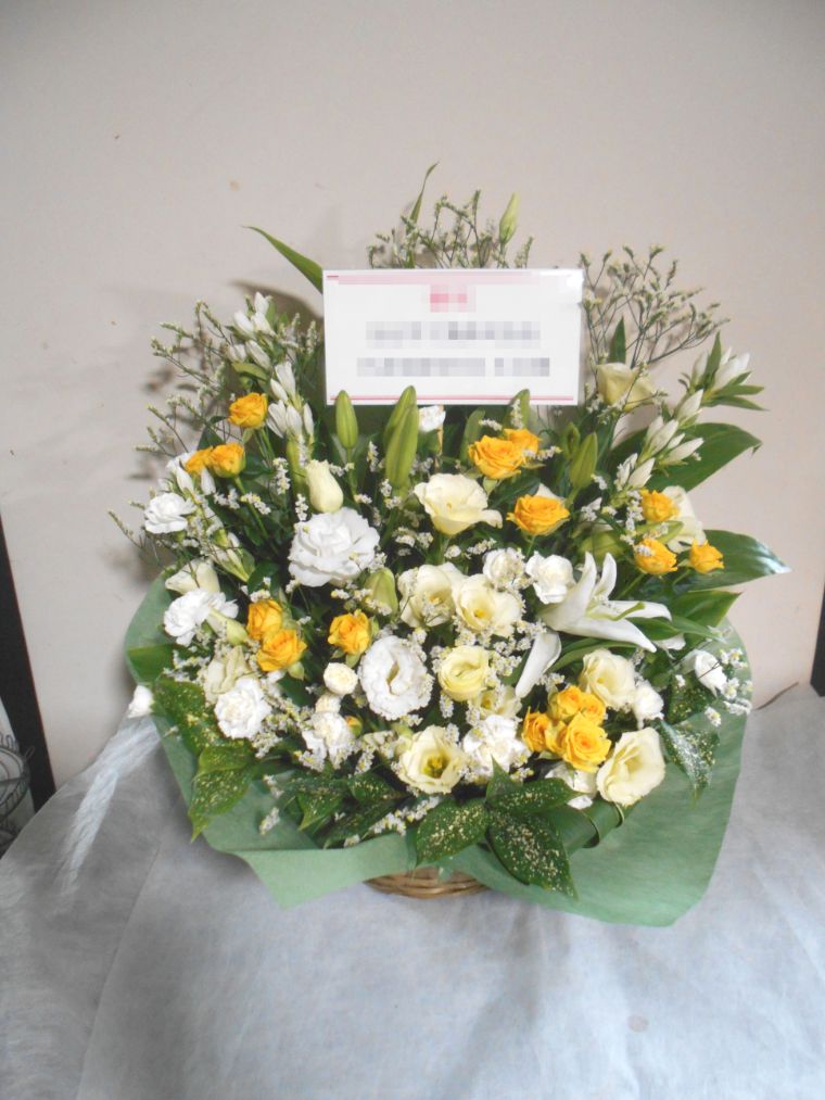 お悔やみ お供えの花 供花 (黄ユリをメインにホワイト系でまとめたバスケットアレンジ)