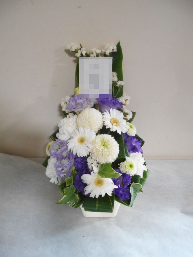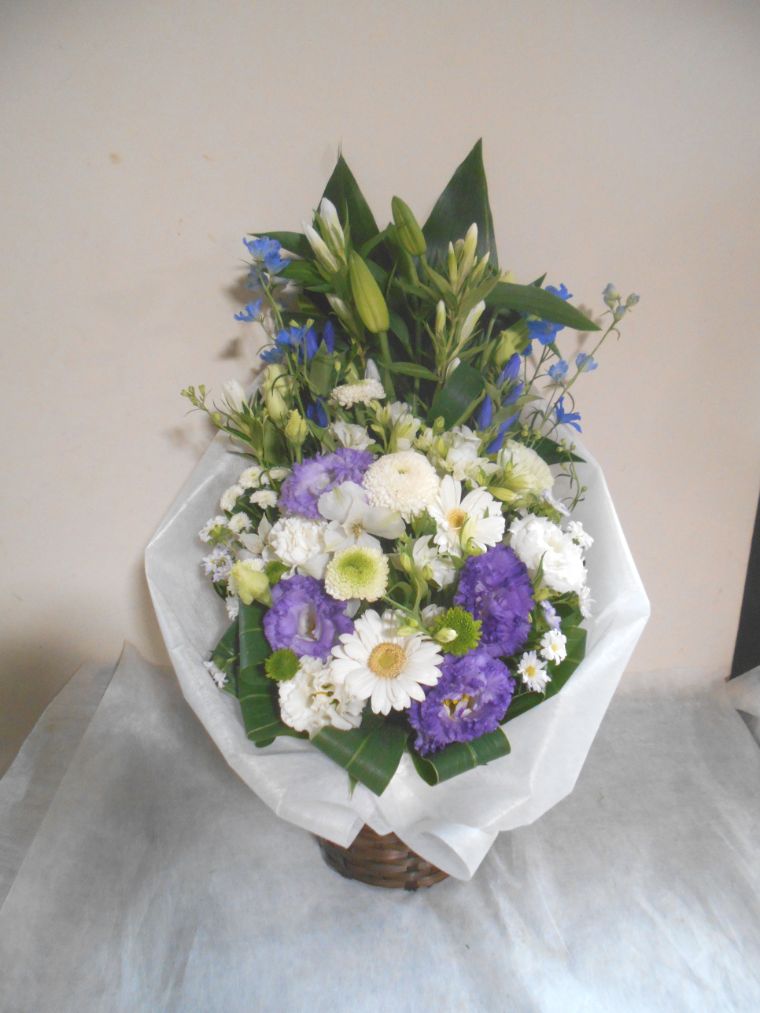 お悔やみ お供えの花 供花 (ホワイト&青・紫系カラーのお花でまとめたバスケットアレンジ)