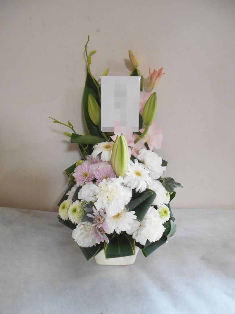 【白系】お悔やみ お供えの花 供花 (ピンクのユリをメインにして白系でまとめたバスケットアレンジ)