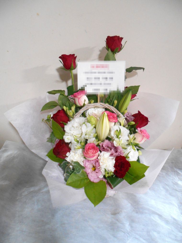 アレンジメントの実際にお届けした写真です。花秘書では発送前に写真をメールで送信致しますので安心して大切な顧客や取引様へのギフトにご利用頂けます。