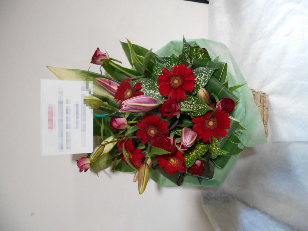 アレンジメントの実際にお届けした写真です。花秘書では発送前に写真をメールで送信致しますので安心して大切な顧客や取引様へのギフトにご利用頂けます。