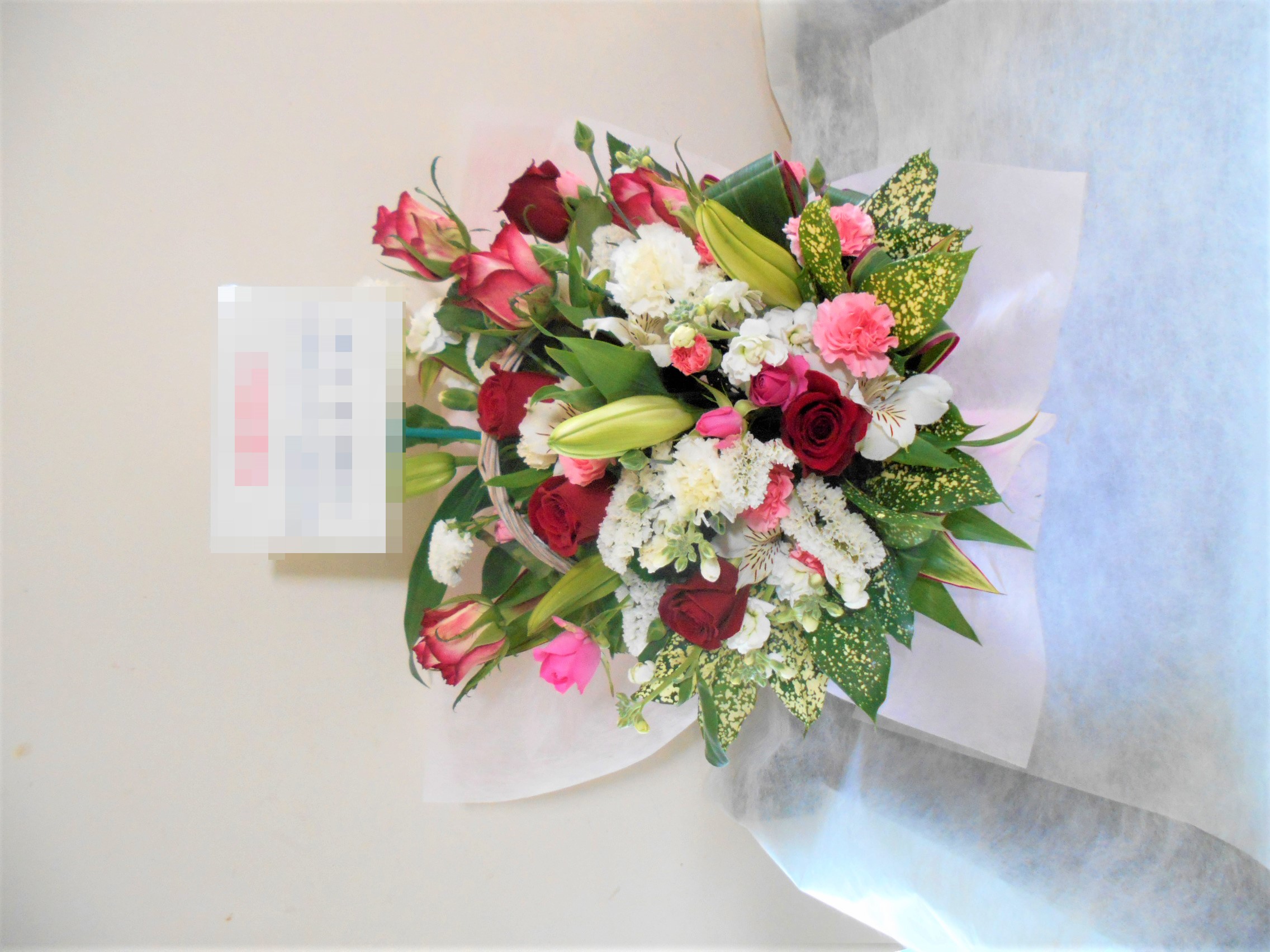 アレンジメントの実際にお届けした写真です。花秘書では発送前に写真をメールで送信致しますので安心して大切な顧客や取引様へのギフトにご利用頂けます。