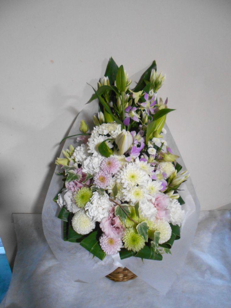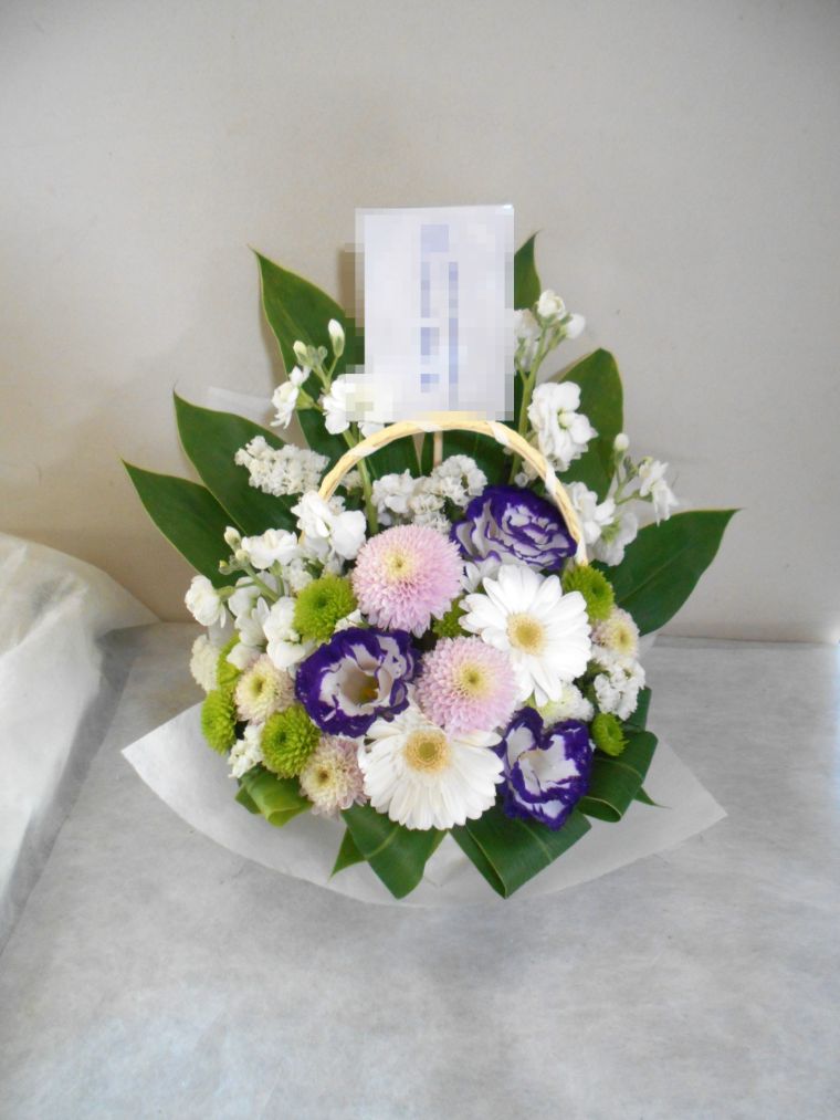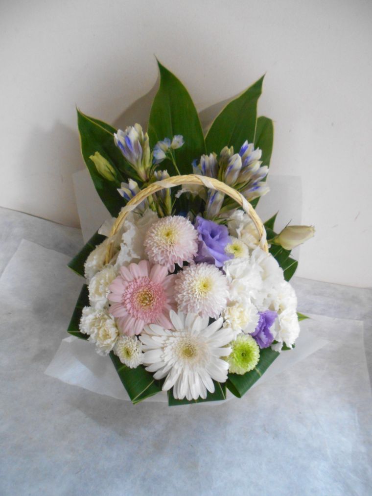 お悔やみ お供えの花 供花 (ホワイト&淡色カラーの手付きバスケットアレンジ)
