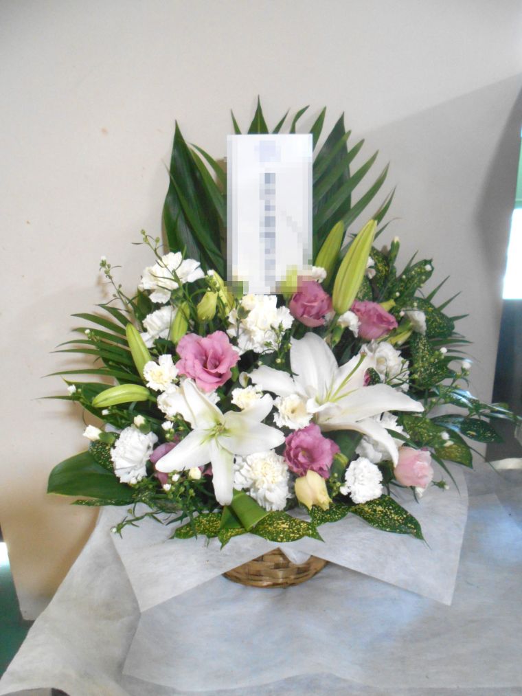 お悔やみ お供えの花 供花 (ユリをメインに白&ピンクでまとめたバスケットアレンジ)