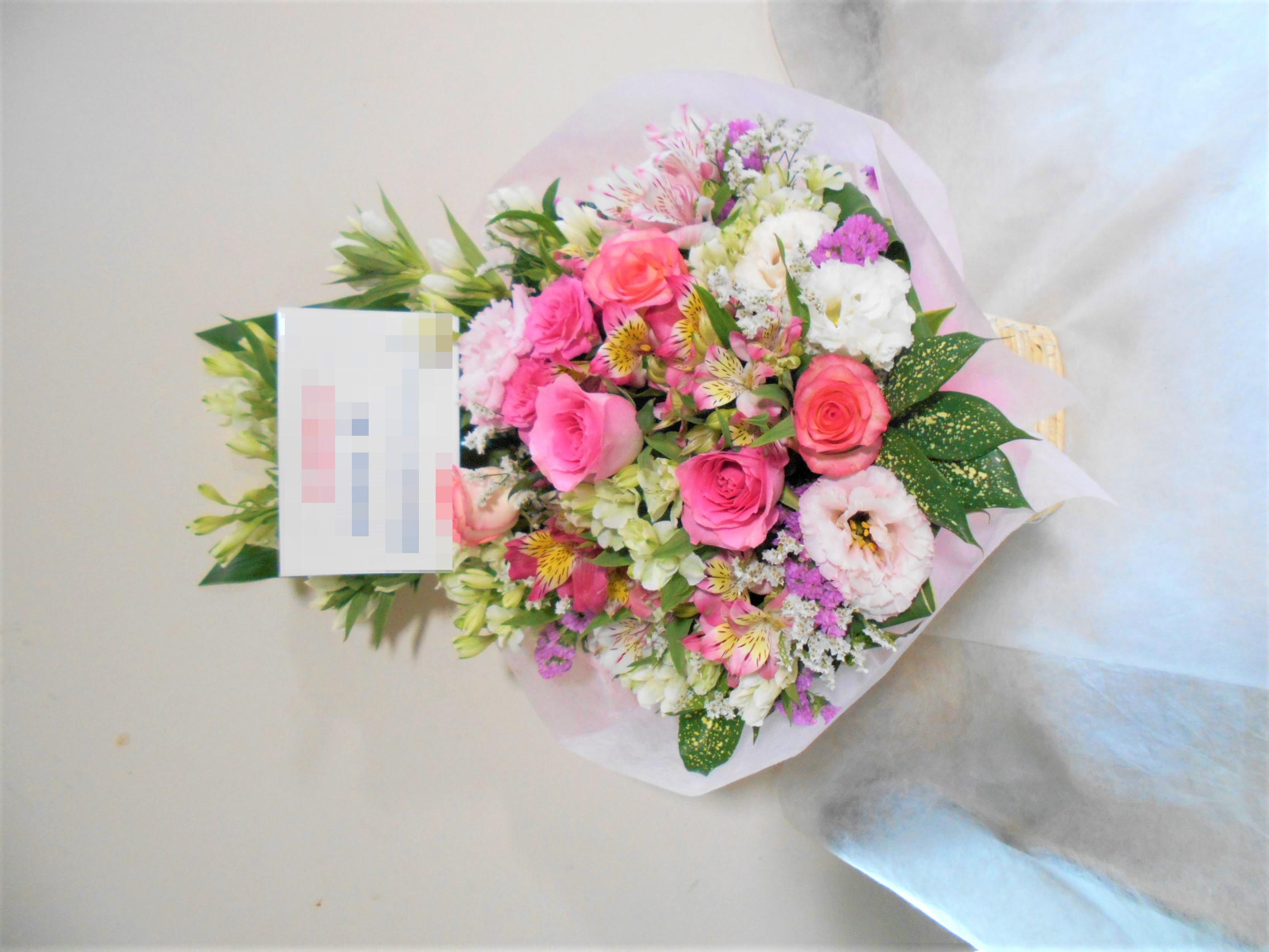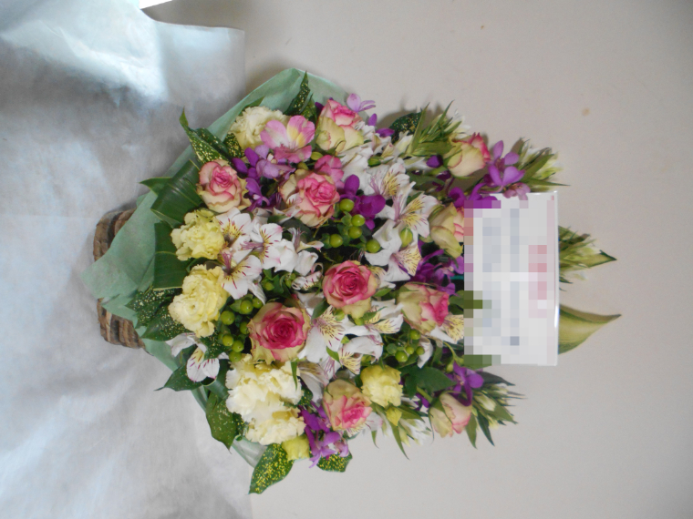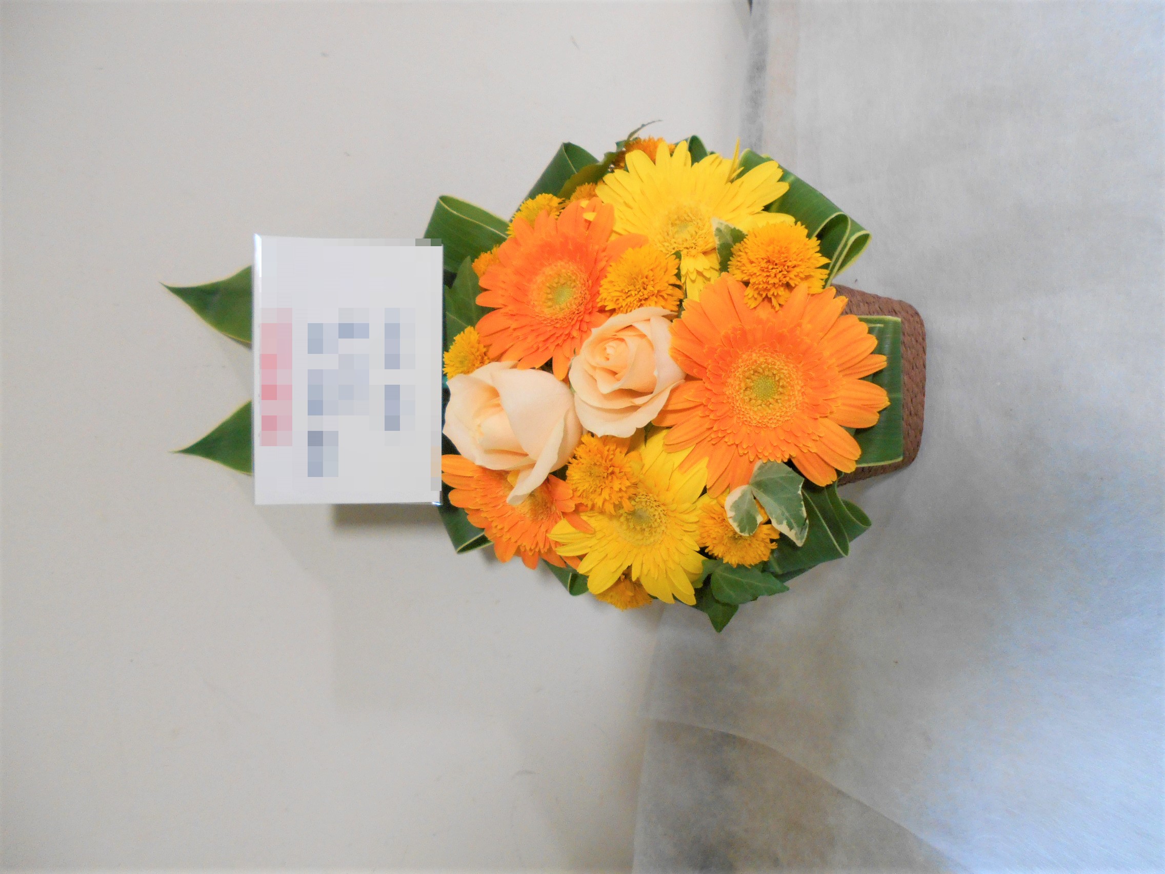 アレンジメントの実際にお届けした写真です。花秘書では発送前に写真をメールで送信致しますので安心して大切な顧客や取引様へのギフトにご利用頂けます。