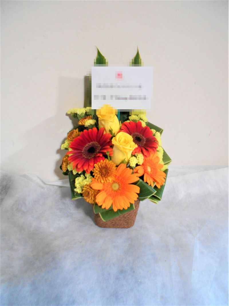 アレンジメントの実際にお届けした写真です。花秘書では発送前に写真をメールで送信致しますので安心して大切な顧客や取引様へのギフトにご利用頂けます。