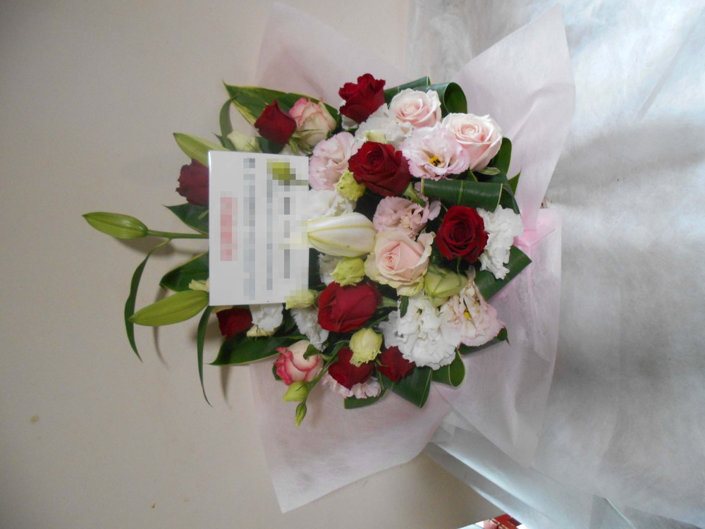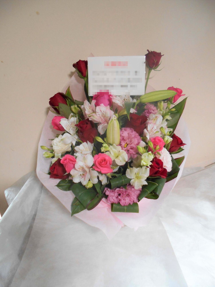 アレンジメントの実際にお届けした写真です。花秘書では発送前に写真をメールで送信致しますので安心して大切な顧客や取引様へのギフトにご利用頂けます。