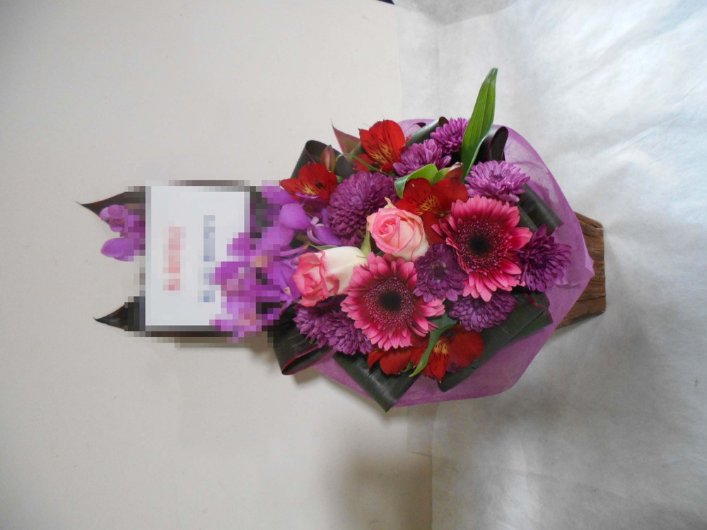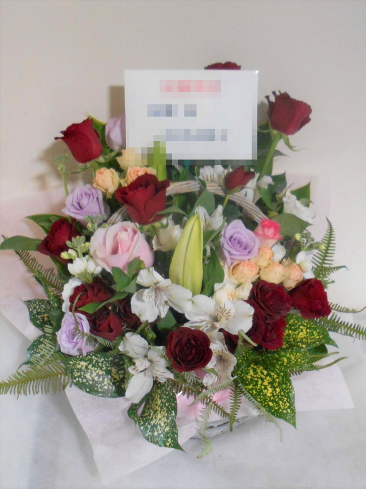 アレンジメントの実際にお届けした写真です。花秘書では発送前に写真をメールで送信致しますので安心して大切な顧客や取引様へのギフトにご利用頂けます。