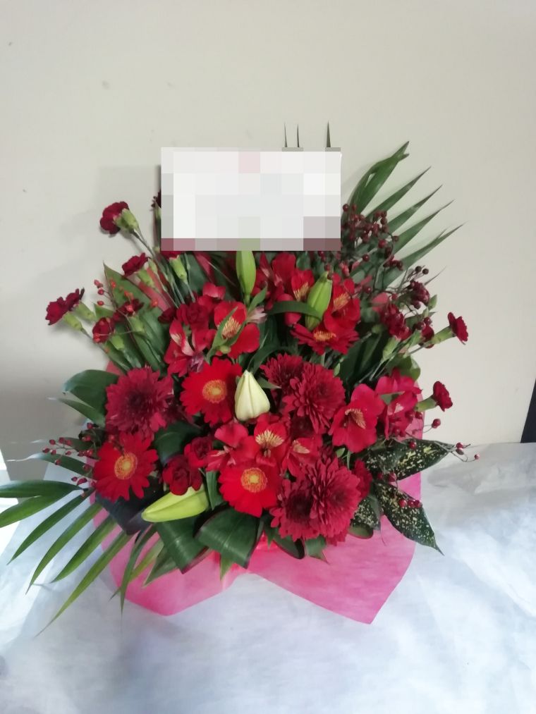 アレンジメントの実際にお届けした写真です。花秘書では発送前に写真をメールで送信致しますので安心して大切な顧客や取引様へのギフトにご利用頂けます。