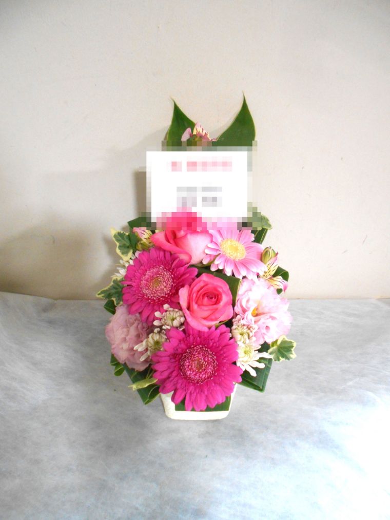 アレンジメントの実際にお届けした写真です。花秘書では発送前に写真をメールで送信致しますので安心して大切な顧客や取引様へのギフトにご利用頂けます。