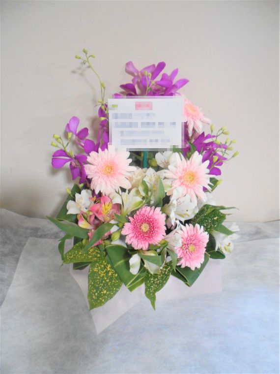 アレンジメントの実際にお届けした写真です。花秘書では発送前に写真をメールで送信致しますので安心して大切な顧客や取引様へのギフトにご利用頂けます。