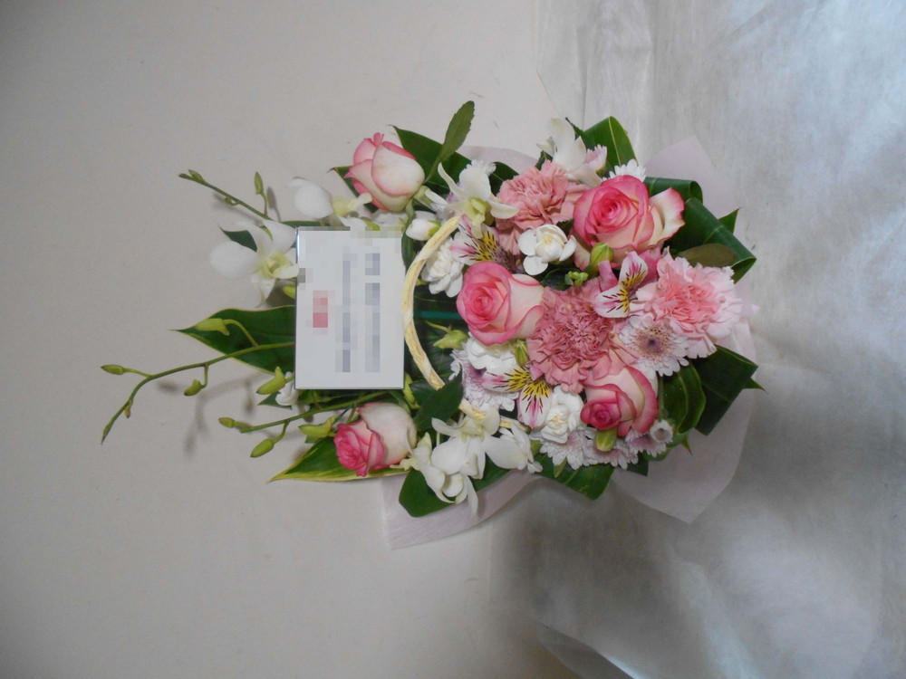 アレンジメントの実際にお届けした写真です。花秘書では発送前に写真をメールで送信致しますので安心して大切な顧客や取引様へのギフトにご利用頂けます。