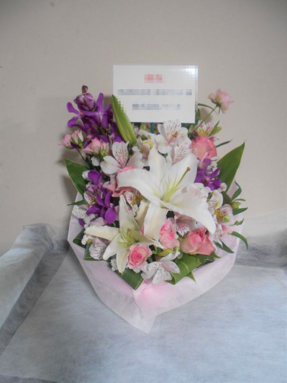 アレンジメントの実際にお届けした写真です。花秘書では発送前に写真をメールで送信致しますので安心して大切な顧客や取引様へのギフトにご利用頂けます。