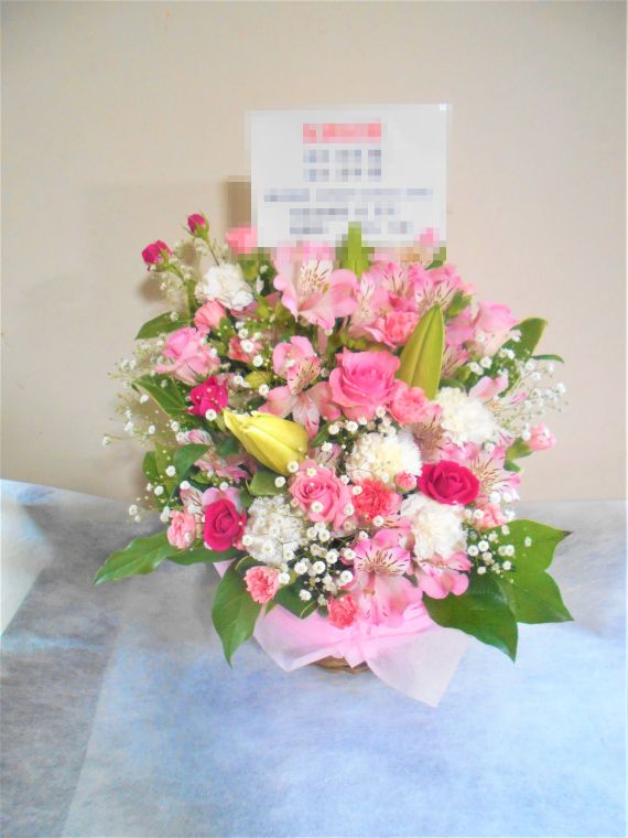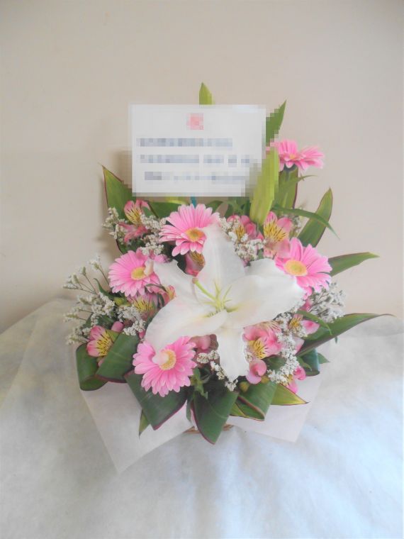 アレンジメントの実際にお届けした写真です。花秘書では発送前に写真をメールで送信致しますので安心して大切な顧客や取引様へのギフトにご利用頂けます。