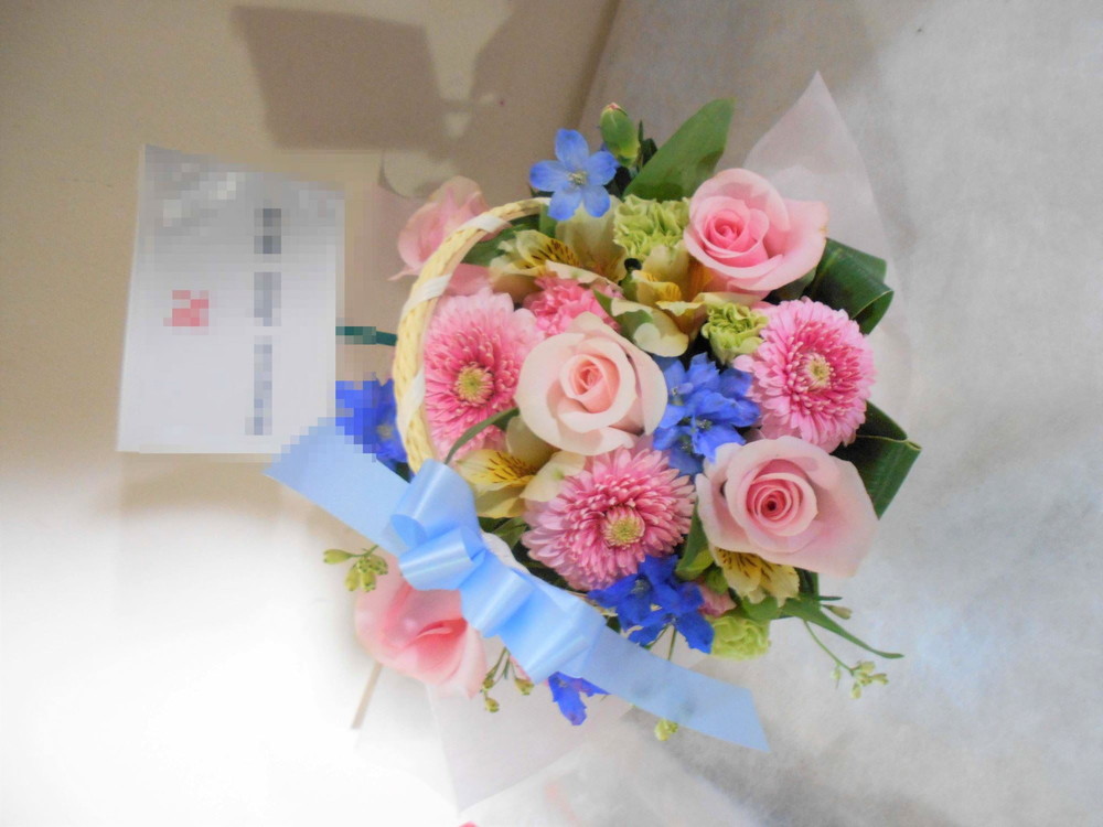 お悔やみ お供えの花 供花 (ホワイトにブルー系の挿し色を添えたバスケットアレンジ)