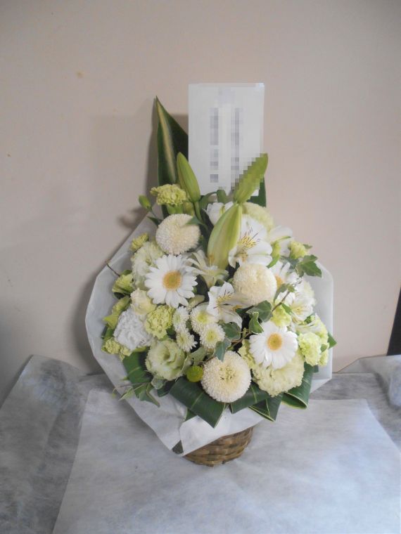 お悔やみ お供えの花 供花 (ホワイト&淡色カラーの手付きバスケットアレンジ)