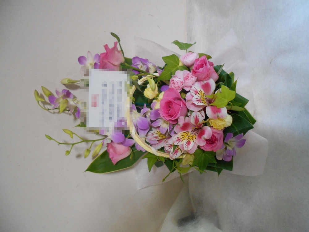 お悔やみ お供えの花 供花 (ホワイト&淡色カラーの手付きバスケットアレンジ)