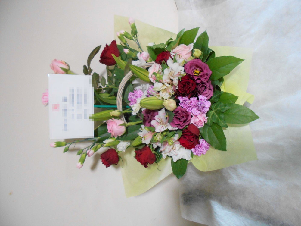 アレンジメントの実際にお届けした写真です。花秘書では発送前に写真をメールで送信致しますので安心して大切な顧客や取引様へのギフトにご利用頂けます。