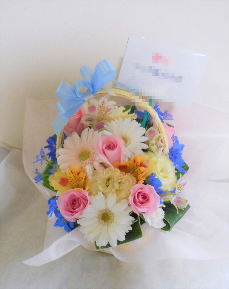 お悔やみ お供えの花 供花 (ホワイトにブルー系の挿し色を添えたバスケットアレンジ)