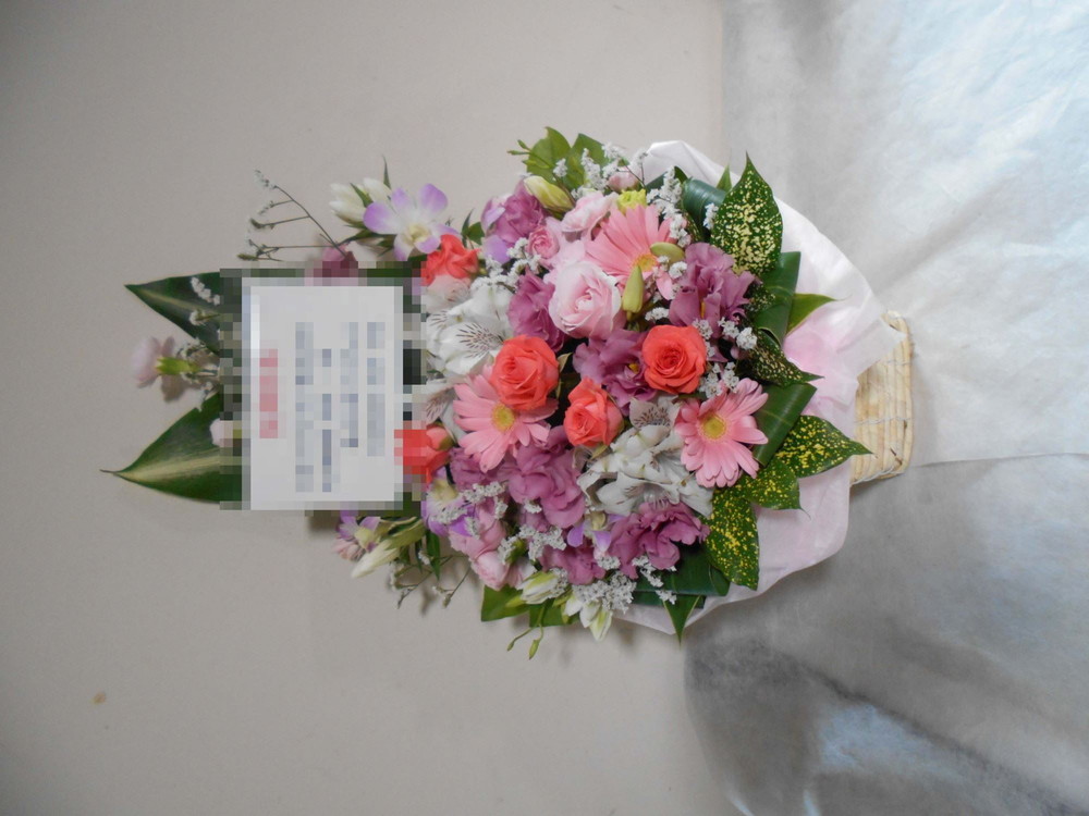 アレンジメントの実際にお届けした写真です。花秘書では発送前に写真をメールで送信致しますので安心して大切な顧客や取引様へのギフトにご利用頂けます。