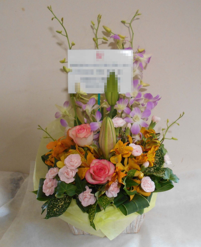 アレンジメントの実際にお届けした写真です。花秘書では発送前に写真をメールで送信致しますので安心して大切な顧客や取引様へのギフトにご利用頂けます。